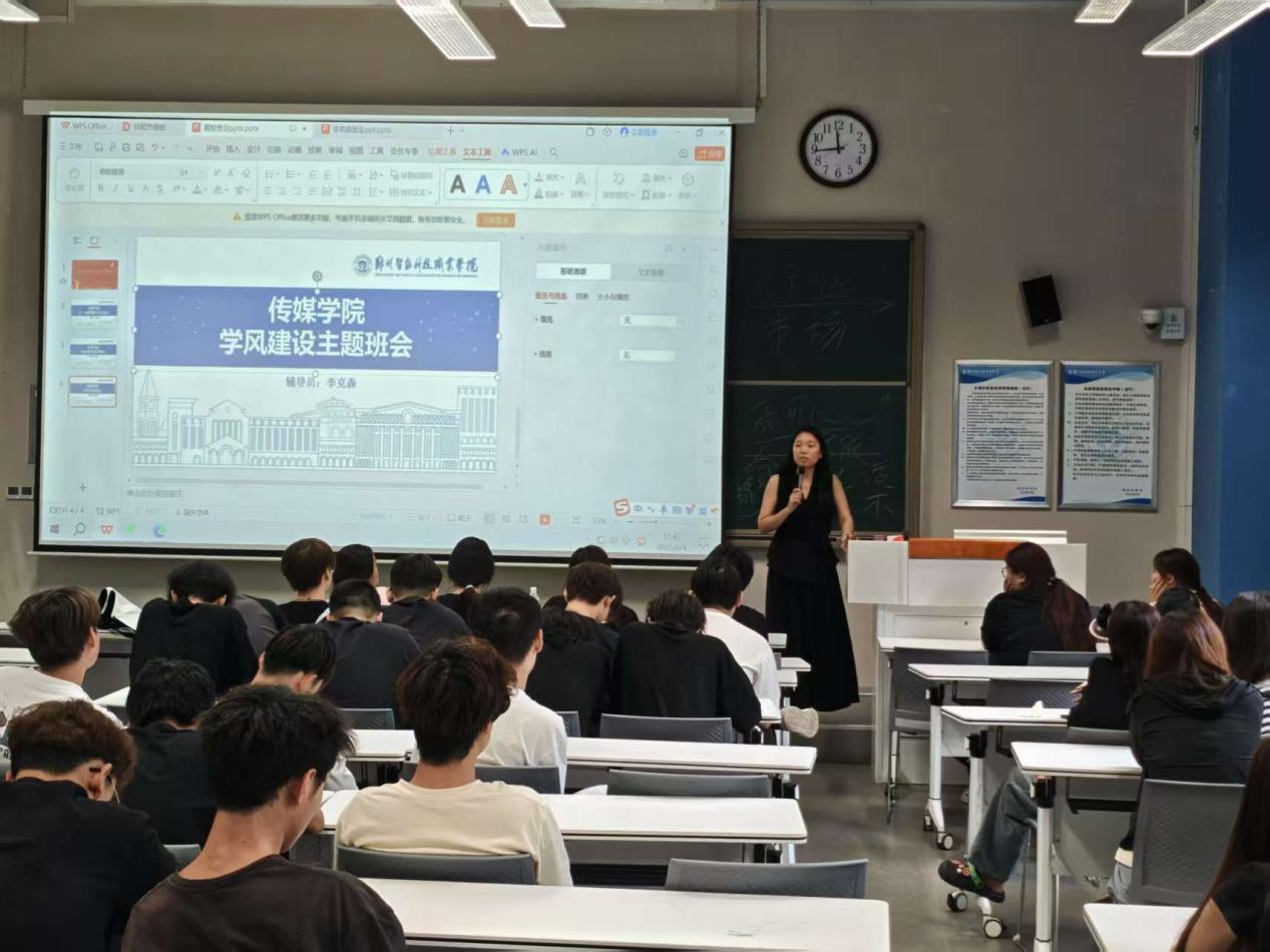 为持续深化新时代高校学风建设工作,营造良好学习氛围。近日,传媒学院辅导员李克森组织班级全体同学,在朝新楼101教室召开“明德笃行·创优学风”主题班会。班会紧扣学风建设核心命题,系统探讨学风提升路径与举措,为培育高素质传媒人才筑牢根基。 班会伊始,李克森对班级学习现状进行剖析,指出大二是专业能力提升的关键期,虽整体学习劲头足,但部分同学存在实践参与度不足、理论知识掌握不扎实等问题,希望借此次班会激发学习主动性。随后,同学们围绕 “严守纪律、勤思善学、实践创新、诚信应考、锚定目标” 展开热烈讨论。讨论结束后,全体同学签署《班级学风建设承诺书》,从规范课堂纪律、强化自主学习、积极投身实践、恪守考试诚信等方面作出承诺。 班会最后,李克森作总结发言。她强调,学风是班级建设的核心,关乎每位同学成长。全体同学要以承诺书为指引,将学习计划落到实处,做到知行合一;同时发挥“传帮带”小组作用,促进同学间互帮互学、共同进步。此次班会为学院学风建设注入动力,助力传媒学子在成长道路上迈向新高度。 审核:石冰清 初审:宋晓焱 编辑:李克森 排版:李思莹