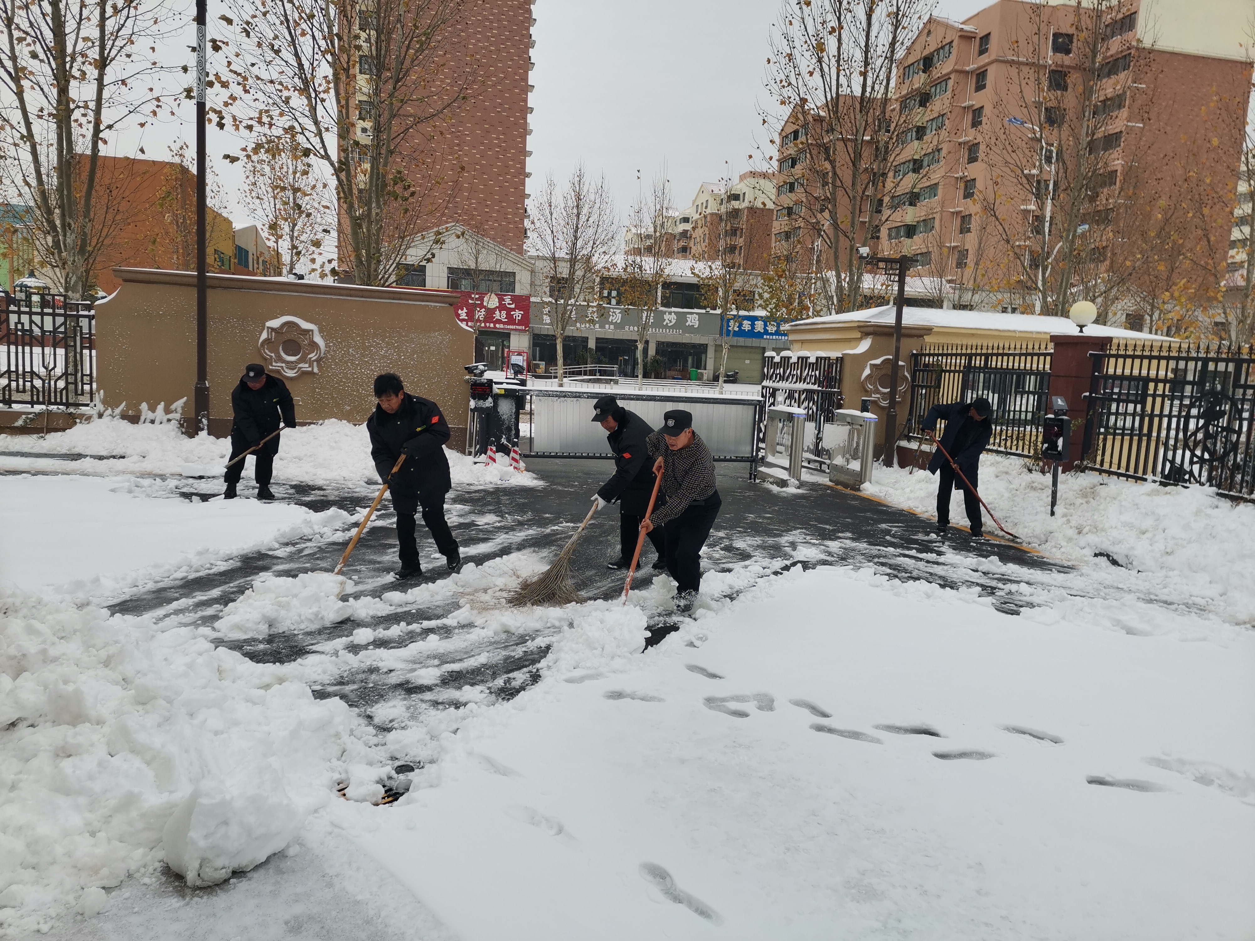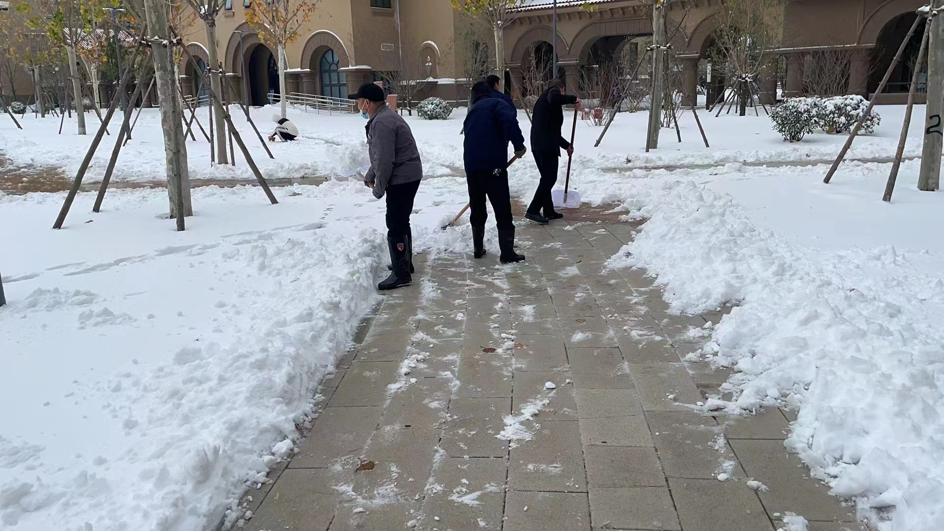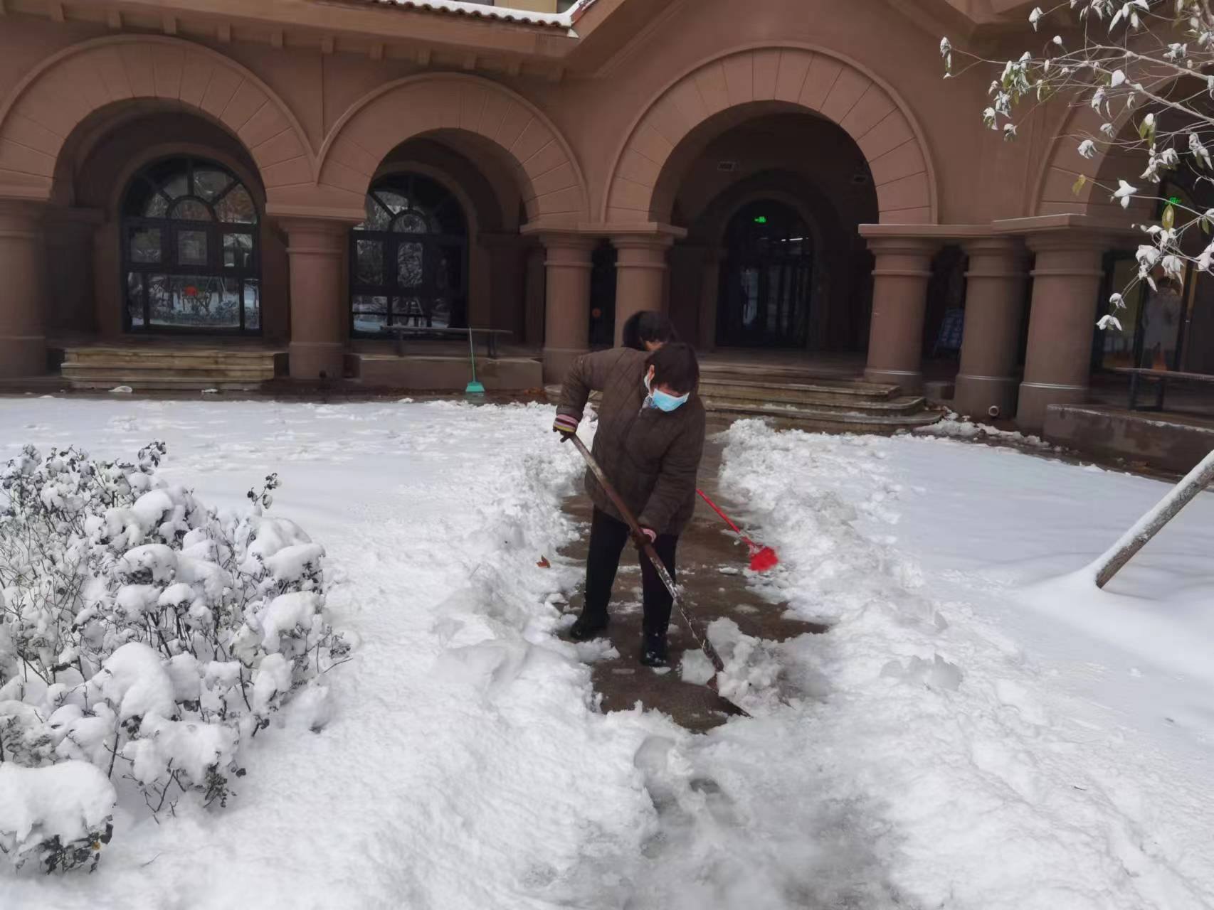 12月11日,预报的暴雪如约而至,校园被厚厚的皑皑雪花覆盖,整个校园看上去银装素裹,分外妖娆。同学们还在睡梦当中,后勤团队早已经是挥着铁锹,舞动着大扫把,三五成群地为师生清理校园积雪,以确保师生出行顺畅。