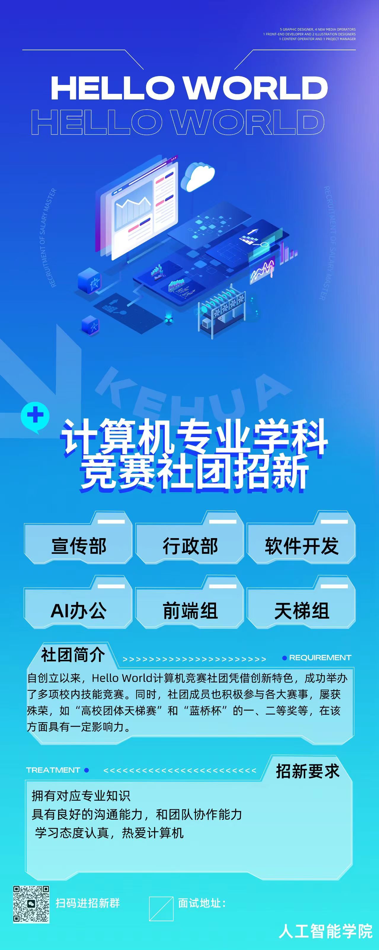 “Hello World”计算机竞赛社团是一个充满活力和创造力的团队,我们欢迎对计算机技术有浓厚兴趣和热情的同学加入我们的行列。无论你是初学者还是高手,只要你热爱学习、热爱生活,我们都将为你提供一个展示才华、实现梦想的舞台。在这里,你将与志同道合的伙伴共同成长,不断提升自己的编程能力和综合素质。让我们携手共进,创造更美好的未来!