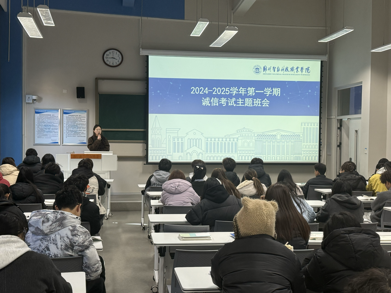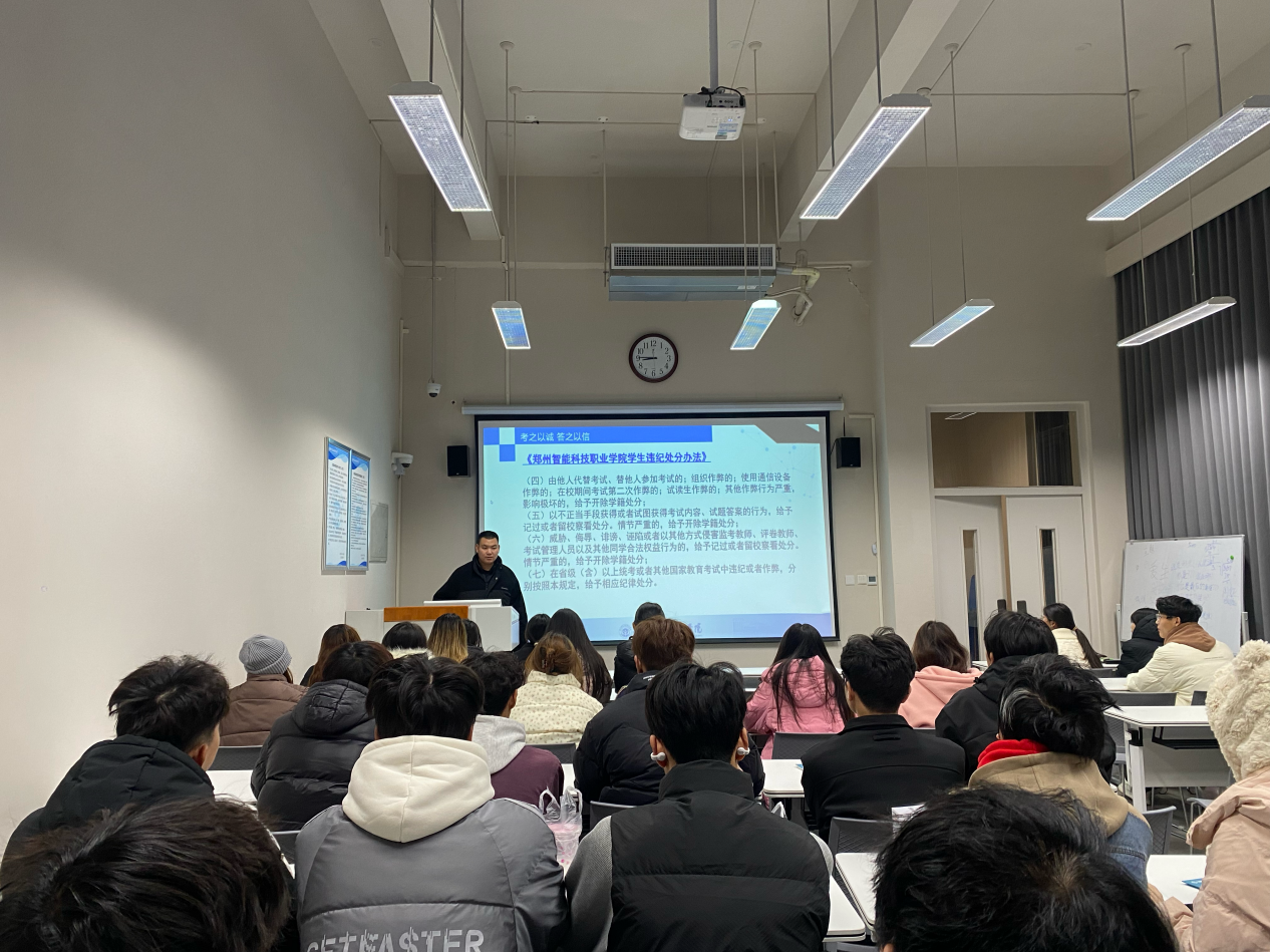 发布日期:2024-12-30 访问次数:为切实推进人工智能学院学风建设迈向新高度,全方位确保考试公平公正、秩序井然,筑牢诚信考试防线,同时扎实做好假期前安全警示教育工作,为全院学生假期生活保驾护航。12月15日,我院组织开展“严肃考风考纪,加强假期安全”主题班会,班会由辅导员主持,在校全体同学参加。