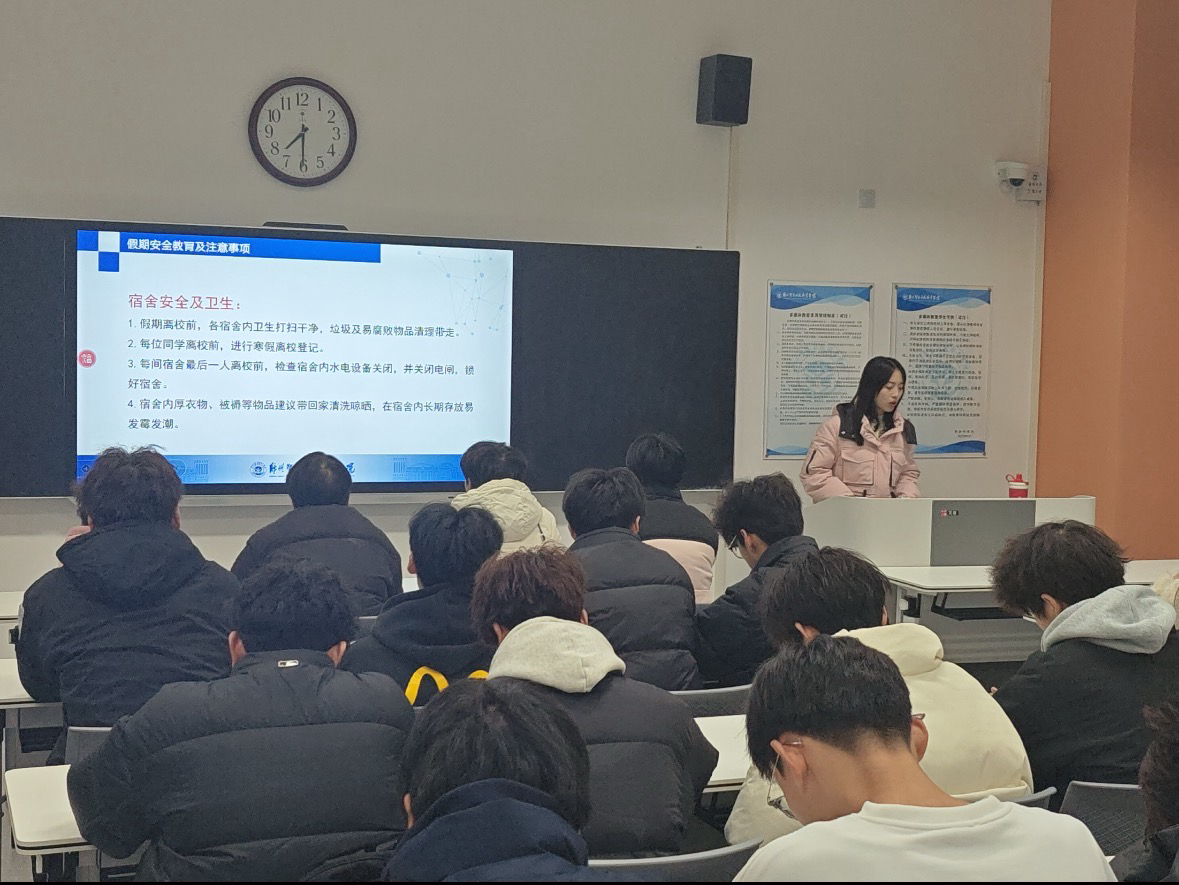 随后,各年级辅导员老师们结合经典案例,讲解了常见的假期安全风险。寒假将至,并提醒各班同学要做好以下几点:第一,要做好离校前的相关准备,确保宿舍安全、关闭电闸,并妥善保管个人贵重物品。第二,要注意防范假期可能存在的各类安全隐患,如出行交通安全、居家用电用火安全、网络电信诈骗防范等方面。第三,离校返家途中要注意人身财产安全,乘坐正规交通工具,不要轻易相信陌生人。同时,建议同学们合理安排寒假时间,在休息放松的同时不忘巩固学业与提升自我,可以多阅读有益书籍、参与社会实践或家庭劳动等。