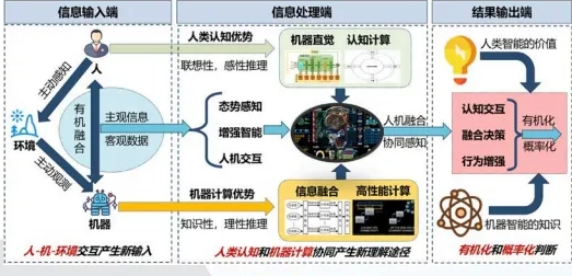 如图 1 所示,本文结合人机融合智能的发展特点和技术优势,提供了一套通用的人机融合智能体系框架。具体而言,在信息输入端,人机融合智能不是单独利用机器获取的客观数据,或者仅使用人类感知器官获得的主观信息,而是将人类观测数据和机器感知数据有机结合起来,两者互为补充,从而得到基于人 - 机 - 环境交互产生新的输入信息。在信息处理端,人机融合智能利用人机不同的优势,把人类的认知优势和机器的计算优势相融合,从而开拓新型理解途径。人机融合智能不仅结合了受人类认知优势启发的机器直觉和认知计算技术,而且考虑了机器计算优势所提供的信息融合和高性能计算技术。此外,受益于态势感知,增强智能,以及人机交互技术将主观信息和客观数据相结合,实现了充分的人机融合和协同感知。在结果输出端,人机融合智能把人类在决策时展现的价值观融入机器算法的迭代之中,从而得到有机化和概率化的判断。在人机融合智能的科学体系中,人类会对自身知识进行辩证的思考,机器从人类在不同场景下做出的选择和决策中学习不同因素的价值权重,这将使得人类和机器之间的关系由单向决策转变为双向理解,从而把人类的主观能动性和机器的客观、被动的特性融合起来,继而形成一套新的体系框架。
