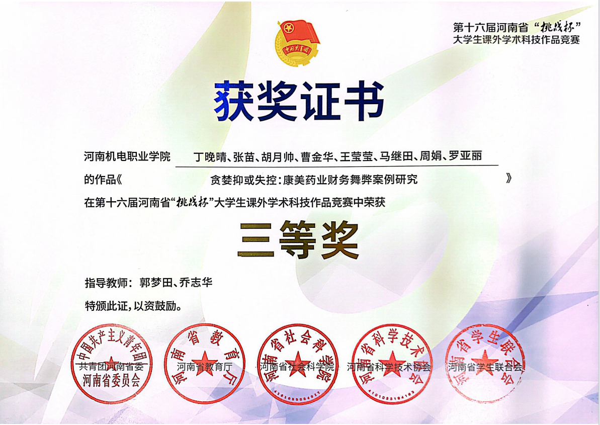 在创新创业领域,成绩斐然,多次参与“互联网+”“挑战杯”“中华职教社”等省级、国家级赛事并屡获大奖。