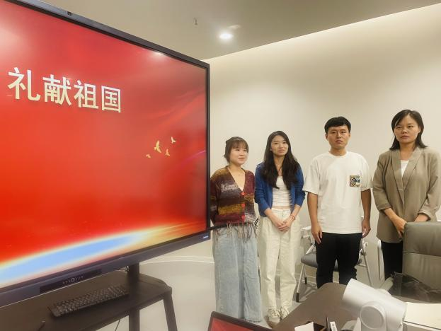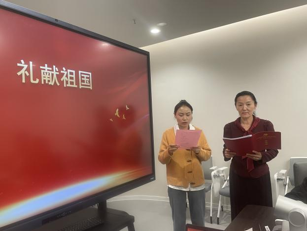 活动的第三项是礼献祖国。党支部书记郭琰和尤梦娜老师共同朗诵诗歌《中华颂》,用饱满的情感和激昂的语调歌颂伟大的祖国。辅导员老师们合唱歌曲《我和我的祖国》,悠扬的歌声抒发了他们对祖国的深深的热爱。专任教师们合唱歌曲《歌唱祖国》,将活动气氛推向了高潮。