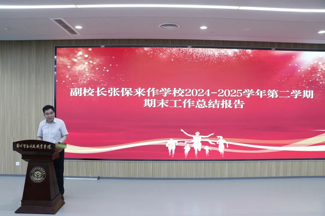 张保来代表学校作期末工作总结报告。报告指出,浦京坚持以习近平新时代中国特色社会主义思想为指导,按照省教育厅的统一安排部署,在董事会的坚强领导下,全体师生员工聚焦强基达标、提质增效、特色发展三项重点任务,大力实施八项重点工作,勠力同心、奋勇拼搏,学校各项工作取得显著成效。今年以来,学校党的建设持续加强、校园安全防线更加牢固、学校内涵建设不断深化、“大思政”育人格局初步成型、产教融合持续深化、教师队伍建设提质增效、内部治理效能显著提、校园公共服务全面升级。随后,张保来针对暑期十项重点工作进行安排。