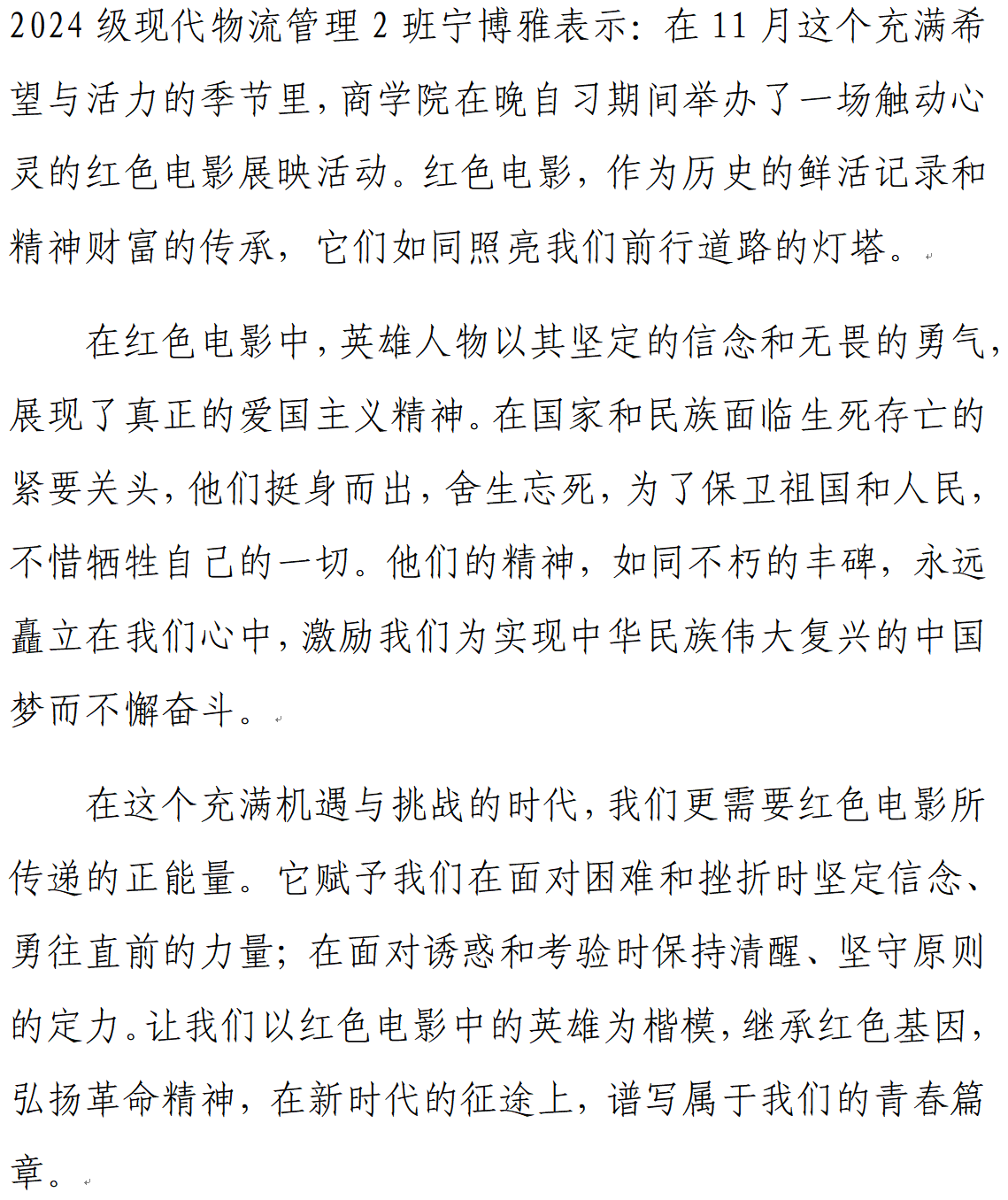红色电影之夜不仅为商学院的学生们提供了一个学习和交流的平台,更是一次精神的洗礼和心灵的触动。让我们铭记历史,珍惜当下,共同为实现中国梦贡献青春力量