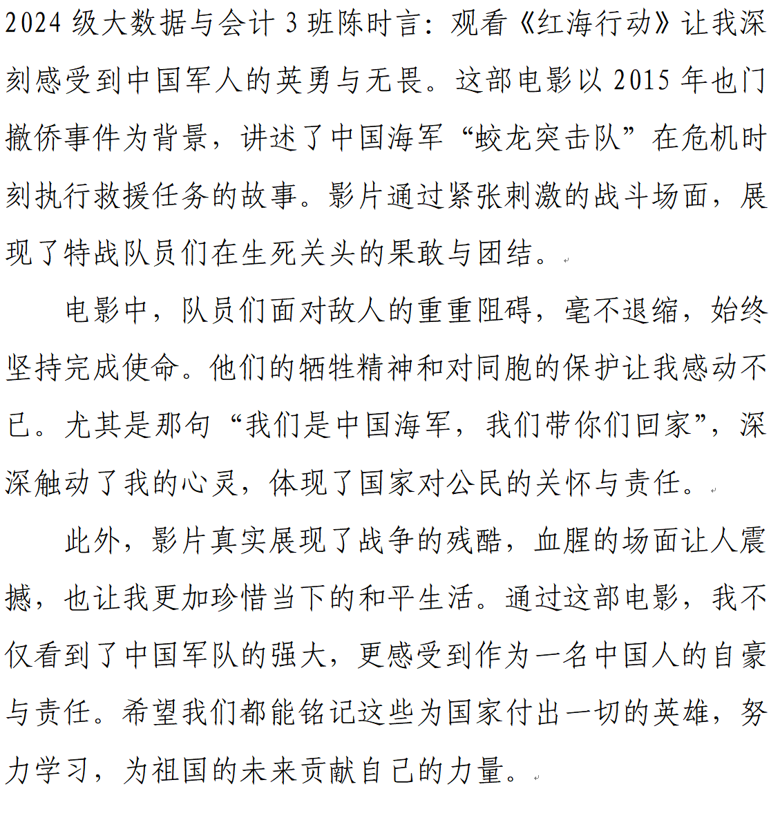 在观影过程中,学生们被影片中的英雄事迹深深打动,感受到了革命精神的力量。电影不仅让学生们对历史有了更深刻的理解,也激发了他们为实现中华民族伟大复兴而努力学习和奋斗的决心。