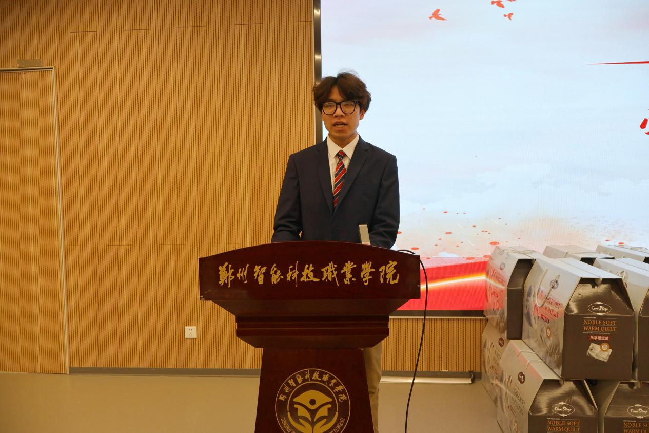 随后,人工智能学院胡可乐同学作为学生代表发言。他首先对学校给予的深切关怀与无私关爱表达了诚挚的谢意,并表示将倍加珍惜这份来自学校的关怀,把感恩之心、感激之情转化为刻苦学习的动力,不辜负学校的期望,以实际行动回馈国家、奉献社会。