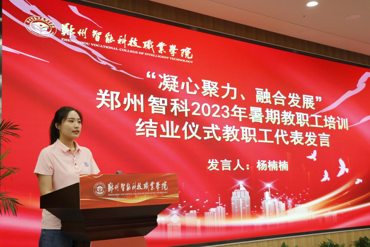 结业仪式上,胡晨、杨楠楠、张成林、孔乔星、马静静等五位教职工代表依次作了精彩发言,纷纷表示本次培训让他们在学习活动中实现了相识、相知、相友,为大家在今后的工作中能够充分沟通、互相帮助打下了坚实的基础;并一一表态要从现在的一点一滴做起,用行动诠释教育的伟大意义,立足自身岗位,认真履职尽责,保质保量完成自己工作岗位所要求的任务,在该奋斗的岁月里,对得起每一寸光阴。