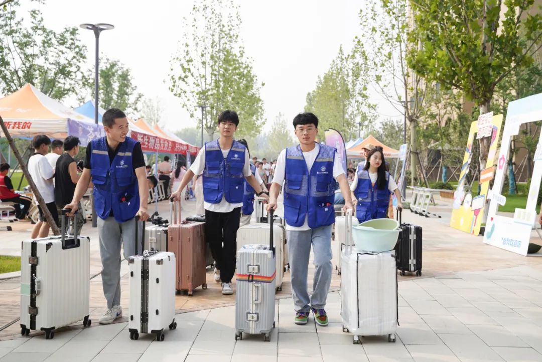 老师们在孟庄地铁站执行接站工作,学校的接驳车也严阵以待,为同学们运送行李。校园向全部家长和同学开放,凭录取通知书可自由进出。校园周边道路由工作人员协调疏通、维持秩序。开放的校园让家长能够陪同新生走进校园,进一步了解学校的环境和文化,促进家校协同,更好地做好育人工作。