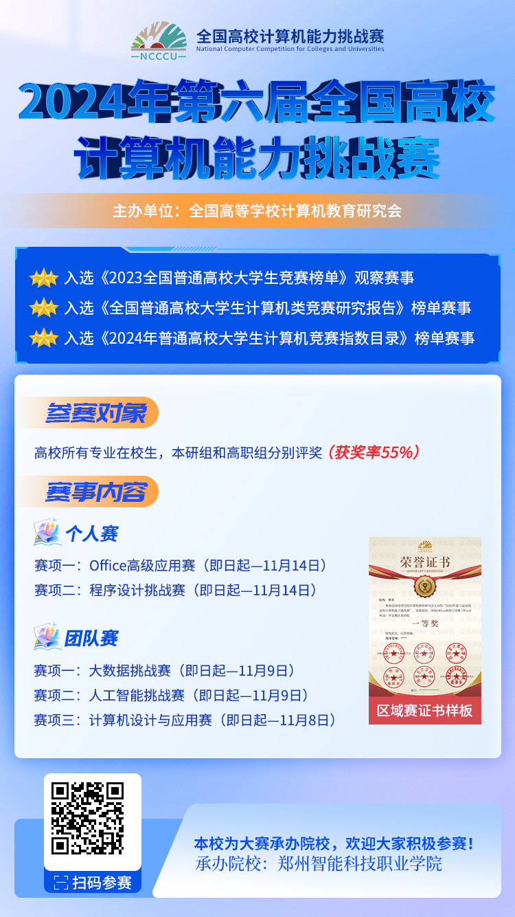 全国高校计算机能力挑战赛由全国高等学校计算机教育研究会主办。现已进入中国高等教育学会发布的《全国普通高校学科竞赛排行榜》观察目录、《全国普通高校大学生计算机类竞赛研究报告》榜单赛事、《2024年普通高校大学生计算机竞赛指数》榜单赛事。旨在通过实战演练的方式,检验并提升大学生的计算机编程能力、算法设计能力、系统分析与解决问题的能力。